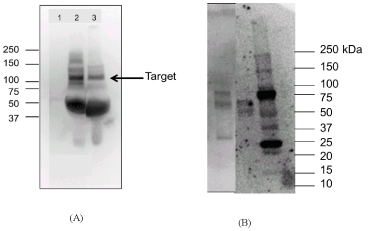 Extract produced from the DNA amyloid transformed yeast culture was used for determining the molecular weight of the amyloid protein. Amyloid precursor protein produced in bacteria as a fragment (45 kDa) (see above) was used as a control reference. Extract from the DNA amyloid yeast culture was produced through different steps including centrifugation for 190 minutes at 9000 rpm, pellet resuspension in nuclease free deionized water, followed by sonication at different cycles and centrifugation. The supernatant from centrifugation was filtered through 0.2 µm or 0.45 µm for the DNA amyloid bacteria culture or DNA amyloid yeast culture, respectively. This extract containing the amyloid protein was subjected to purification.