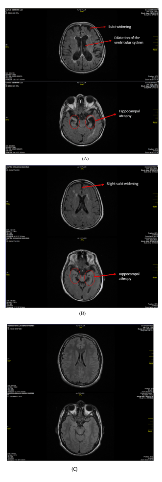 Figures 8. A. shows the comparative MRI results from patients clinically diagnosed with Alzheimer’s versus healthy patients, using extract of yeast DNA β-Amyloid sensor. B. shows the MRI of pre-Alzheimer’s patient (5) using extract of yeast DNA β -Amyloid sensor. C. shows the MRI of a healthy patient without encephalic alterations [24] using extract of yeast DNA β-Amyloid sensor