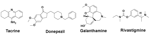 Despite Menantine Hydrochloride, other four FDA certified drugs (Figure 1) are all AChEIs, including Tacrine, Donepezil, Galanthamine and Rivastigmine [27-30]. Tacrine lost its market because of its hepatotoxicity. Donepezil and Galanthamine are both reversible inhibitors, indicating limited treatment effect thus being recommended for the early and moderate period of AD. Only Rivastigmine is the pseudo-irreversibility inhibitor, which can prolong the existing time of acetylcholine thus protect the conduction of neural signals. An extra inhibition site of Rivastigmine may be Butyrylcholinesterase (BuChE), another possible target of treating AD. Developing new trails on AChEIs from Rivastigmine is a meaningful and practical approach for curing AD and even other neurodegenerative disease.