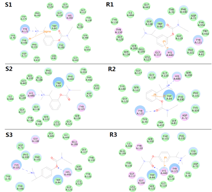 To visualize the binding patterns of the studied compounds, we presented the 2D maps in Figure 3. Though Rivastigmine was presupposed in other works to decompose from ester group, we took the original status of the studied compounds directly into the active site of AChE to evaluate their initial binding situations. As shown in Figure 3, a major difference between S-conformations and R-conformations was the categories of key interactions. The S-conformations preferred direct hydrogen bonds and sometimes indirect π-σ interactions, whereas the R-conformations all employed π-π or π-cation interactions. According to the reports, if Rivastigmine decomposed, the binding would be weakened to two π-π interactions with TRP84 and PHE330 respectively. Thus, the original status here seemed to indicate better interactions. By retaining the same hydrogen bond with TYR121 with the same pattern and introducing more hydrogen bond with HIS440, S3 and R3 suggested more potential binding pattern than Rivastigmine. The failure of the other three candidates could also be inferred by the binding patterns. R1 lost all potential hydrogen bonds. S2 and R2 seemed to be rotated or reversed in the binding site as their key interactions did not appear at the same positions. The above results were cheerful because the recommended compound S3 was still in similar pattern with Rivastigmine, which enhanced the reliability of the molecular docking simulation. Thus, the future modification can be cautiously carried out consulting these key interactions.