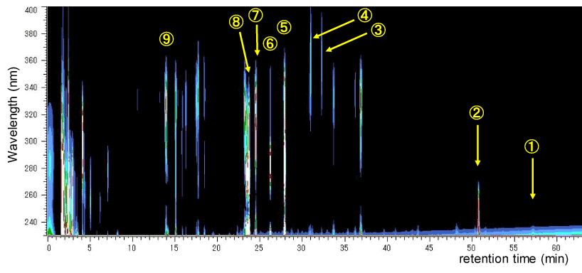 The 3D-HPLC pattern of HET is shown in figure 1. The analysis detected the following substances derived from the crude drug extract: chlorogenic acid from Angelicae Radix; hesperidin and narirutin from Citri Leiocarpae Exocarpium; [6]-gingerol from Zingiberis Rhizoma; liquiritin, isoliquiritin, apioliquiritin, apioisoliquiritin, and glycyrrhizic acid from Glycyrrhiza Radix; and 3-(3-hydroxy-4-methoxyphenyl)-2-(E)-propenoic acid and ferulic acid from Cimicifugae Rhizoma. As expected under these conditions, substances originating from Ginseng Radix, Astragali Radix, Zizyphi Fructus, Atractylodes Rhizoma, Bupleuri Radix could not be detected by this 3D-HPLC. Other peak in the chart also could not be determined the content name.