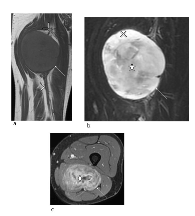Figure 2. Male patient, 42 years old with no relevant medial history: neurofibroma of right sciatic nerve. (a) Coronal T1 slice (TR/TE 568/11) showing a neurogenic lesion (arrow) with isosignal, well-defined margins and no spread to adjacent soft tissues (solid arrow). The tumour is centred relative to the sciatic nerve (arrowhead). (b) Fluid-sensitive coronal slice (TR/TE 3998/72) showing the heterogeneous lesion (arrow) and target sign: central hypointensity (star) and peripheral hyperintensity (cross). (c) Axial T1-weighted fat-suppressed post-gadolinium slice showing heterogeneous uptake in the tumour (arrow) with predominantly central uptake (diamond).