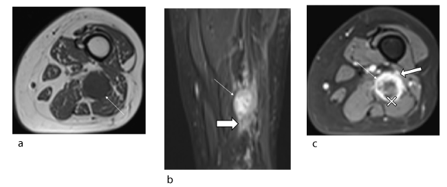 Figure 1. Female patient, 43 years old: schwannoma of the sciatic nerve at the right sciatic notch. (a) Axial T1 slice (TR/TE 850/11) showing a neurogenic lesion (arrow) with isosignal, well-defined margins and no spread to adjacent soft tissues (solid arrow) (b) Fluid-sensitive coronal slice (TR/TE 2200/34) showing the hyperintense lesion (arrow) and absence of target sign. The tumour is off-centred relative to the sciatic nerve (arrowhead). (c) Axial T1-weighted fat-suppressed post-gadolinium slice showing heterogeneous uptake in the tumour (arrow)