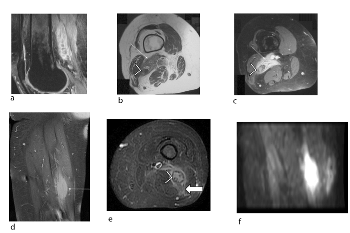 Figure 4. Female patient, 49 years old, lymphoma discovered (confirmed histologically) in the posterior area of the left thigh that invaded the sciatic nerve (a, b, c) during an assessment for knee pain. Intraneural metastasis of the contralateral sciatic nerve developed 1 year later (confirmed histologically) (d, e, f): (a) Sagittal proton density fat-saturated slice (TR/TE 2700/24) showing the tumour (arrow) with heterogeneous signal and tumour invasion (hyperintensity) of the sciatic nerve (arrow head) leading to dissection of the nerve fascicles (hypointense signal). (b) Axial T1 slice (TR/TE 440/11) showing an irregular-shaped tumour (arrow) with ill-defined margins (circle) in the posterior region of the left thigh over the path of the sciatic nerve (arrowhead). (c) Axial T1-weighted fat-suppressed post-gadolinium slice showing homogeneous uptake in the tumour (arrow) with dissection of the sciatic nerve fascicles (arrowhead). (d, e) Coronal and axial slices from proton density fat-saturated sequences (TR/TE 2700/24) showing a fusiform tumour (arrow) of the sciatic nerve with invasion of the adjacent soft tissues (solid arrow), evidence of hematogenous spread to the contralateral side. Note the dissection of the sciatic nerve fascicles (hypointense signal) by the hyperintense infiltrating tumour (arrowhead). (f) Sagittal slice from diffusion-weighted b800 sequence showing hyperintensity, which confirms the lymphatic origin of the tumour.