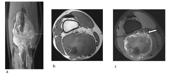 Figure 5. Male patient, 59 years old, suffering from pleural mesothelioma secondary to asbestos exposure. Recent appearance of lump in left thigh: intraneural metastasis of the pleural mesothelioma confirmed histologically. (a) Coronal proton density fat-saturated slice (TR/TE 3000/24) showing the tumour (arrow) with a heterogeneous signal and ill-defined margins (circle) but no target sign. Note the dissection of the hypointense sciatic nerve fascicles (arrowhead) by the hyperintense infiltrating tumour. (b) Axial T1 slice (TR/TE 900/12) showing a large tumour (arrow) centred on the left sciatic nerve (arrowhead) with a heterogeneous signal and ill-defined margins (circle). (c) Axial T1-weighted fat-suppressed post-gadolinium slice showing heterogeneous uptake in the tumour (arrow) with predominantly peripheral uptake and spread into soft tissues (solid arrow). Also note the dissection of the sciatic nerve fascicles (arrowhead).