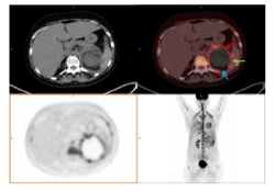 Mucormycosis is an opportunistic infection caused by mycetes of the order Mucorales, that may have fatal consequences in absence of treatment [1]. It mainly affects patients with immunosupression (anemia, neutropenia, hematological malignancies, AIDS), Diabetes Mellitus and it has an incidence of 0.6% in patients who previously received allogenic STC [2]. Its diagnosis is usually difficult and late, mainly because of its clinical unspecific symptoms (fever, chest pain, congestion) and its relatively uncommon global incidence (10-50 less frequent than aspergillosis and candidiasis) and additionally it shows variable image patterns in CT and MRI studies [3]. Due to its ability to detect metabolically active tissue and differentiate it from necrosis, 18F-FDG PET/CT has emerged as a promising tool for the detection of fungal invasive disease. Although it has demonstrated its utility in a limited number of patients with lung, brain, hepatic and splenic candidiasis or mould infections [4,5], as well as cryptococcosis [6], there have been few publications concerning mucormycosis [1,7]. It usually presents as rhino-orbital-cerebral [1] or pulmonary [8] mucormycosis but is much less frequent in other locations as gastrointestinal, skin or other regions [9,10]. Its early diagnosis is mandatory, as a delay of treatment can significantly increase mortality [11]. Treatment usually consists of complete surgical debridement and antifungal therapy. Due to her renal, pancreatic and spleen involvement, surgical debridement was excluded, and she has received a combined therapy of Amphotericin B and Isavuconazole, a new triazole that has shown promising results even as a first line agent in anti-fungal therapy and profilaxis [12,13].