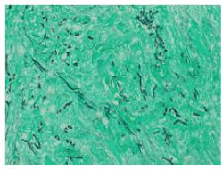 Figure 4. Histopathological images were studied using "Grocott stain", in which the microorganisms are seen as thick, elongated, cylindrical black structures and green background corresponds to necrotic perirenal fatty tissue