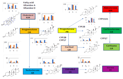 Osaka university shimadzu analytical innovation research laboratory is developing multi omics (MO) package on Garuda platform [1] that have statist analysis (principal components analysis (PCA)) and correlation analysis (the gene ontology analysis and pathway analysis) to treat LC-MS/MS data expressed in KEGG map in Figure 1. We believe that MO that is useful tool to discover a new drug as the interacted inhibitors of the small molecule ligands of nuclear receptor (NR) bound to promoter DNA to control transcription of pharmaceutical active proteins. NR has both L- domain binding to the small molecule ligands and D-domain binding to the promoter DNA as transcription factor. The human 48 NR contain 40 orphan receptors and 8 endocrine receptors that bind steroid hormones ligands produced from cholesterol by metabolism with CYP11, 17, 19 and 21 etc. Some ligands of orphan NR are unknown yet in Figure 2.