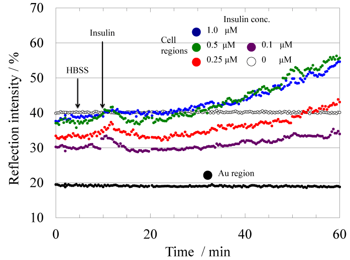 L6 cells (JCRB9081) were obtained from the cell bank of National Institutes of Biomedical Innovation, Health and Nutrition (Japan). Minimum Essential Medium Alpha (MEM-α) and Penicillin-streptomycin were purchased from GIBCO (Tokyo, Japan). Fetal bovine serum (FBS) was obtained from ICN Biomedicals, Inc. Modified Hanks’ balanced salt solution (HBSS) was purchased from Sigma-Aldrich Japan Co. (Tokyo, Japan). Human insulin (Recombinant expressed in Yeast, Animal-Free) was purchased from Nacalaitesque, Inc. (Kyoto, Japan). Insulin analogs (Insulin Aspart; NovoRapid®; Novo Nordisk Pharma Ltd,) was kindly donated by Prof. M.Isobeand Prof. N.Kurosawa, Graduate School of Science and Engineering, University of Toyama, Japan. A 50 nm goldlayer-deposited high refractive index glass (SF6) chip (18x17 mm) was purchased from BAS Inc. (Japan), and flexiPERM® (11x17x10 mm) was purchased from Greiner Bio-One (Germany). Stock solutions of various concentration of insulin and insulin analog were diluted by HBSS to the desired concentration.