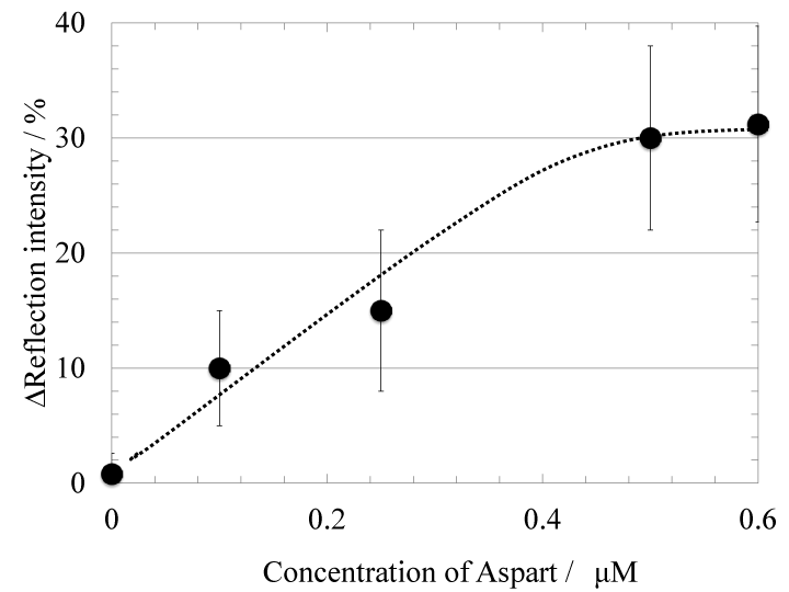 Fig.5 Dependence of the reflection intensity increase on the concentration of Aspart with the myotube cell-based sensor. The reflection intensity increase was read after 50 minutes from Aspart injection.