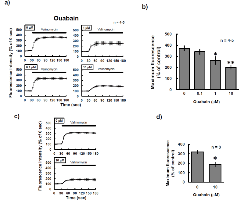 Figure 1: Effects of ouabain on valinomycin-induced alteration of DiSC3(5) fluorescence in P19 cells. P19 cells were cultured at the indicated concentrations of ouabain for a, b) 24 h or c, d) 30 min. a, c) Cells were then loaded with 250 nM DiSC3(5) for 30 min at 37ºC and observed by confocal microscopy, with fluorescence emission at a wavelength of 675 nm. During photo-burst experiments, 2 aM valinomycin was added. The fluorescence intensity of the region of interest was quantified by using Image J. Horizontal black bar indicates period of exposure to valinomycin. b, d) Maximum fluorescence values during continuous shooting experiments in a) or c) were calculated and compared. The experiments were performed several times, as indicated. b) *P<0.05, **P<0.01 vs. control experiment (Dunnett’s test). d) *P<0.05 vs. control experiment (Welch’s t-test).