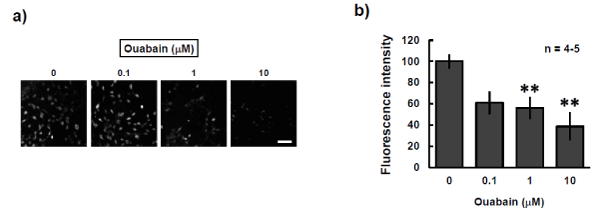 Figure 4: Effect of ouabain on intracellular potassium levels in P19 cells. P19 cells were cultured with the indicated concentrations of ouabain for 24 h and were then stained with Asante Potassium Green-2. a) Representative photo images of P19 cells stained with Asante after the 24-h ouabain exposure period are shown. Scale bar = 100 am. b) The fluorescence intensities of the regions of interest were quantified and compared. The experiments were performed four or five times. **P<0.01 vs. control experiment (Dunnett’s test).