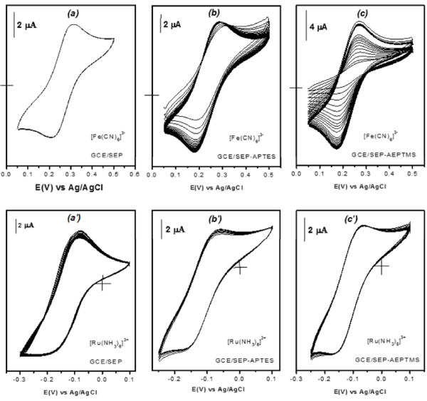 To confirm the idea that the uptake of [Fe(CN)6]3− is governed by electrostatic considerations, the experiments here above described were performed once more but by using the positively charged redox probe [Ru(NH3)6]3+: repetitive potential scans resulted in insignificant faradic response for all working electrodes as shown in Figure 4(a’) to Figure 4(c’). Mainly, not increase in peak height was observed, the steady-state currents recorded on GCE/Sep-APTES and GCE/Sep-AEPTMS corresponding almost to that displayed by GCE/Sep. To conclude this section, one could admit that the efficiency of sepiolite before and after its functionalization is guided by electrostatic forces between the clay material on the electrode surface and that on the analyte. In addition, these results have confirmed the effectivity of the grafting of organosilanes on sepiolite surface as already shown by other characterization techniques.
