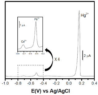 These preliminary results demonstrate the interest of using functionalized sepiolite instead of pristine clay mineral as sensing material for the simultaneous detection of Hg(II), Pb(II) and Cd(II) in the same solution. In a future work, our investigations will be focused on the optimization of the sensor herein proposed, in such a manner to use it in real natural media for the detection of heavy metals.