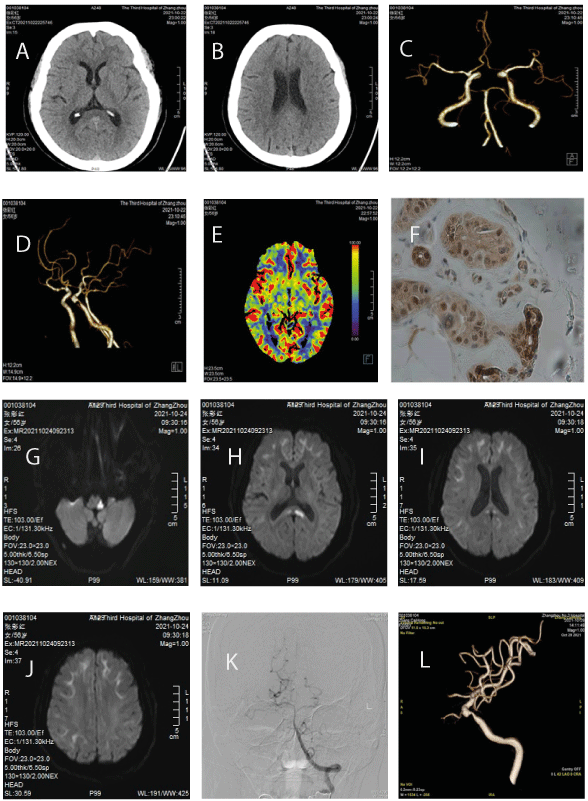 Figure 1. Brain CT scan: A-B, CTA: C-D, CTP: E, Skin biopsy: F, brain MRI: G-J, DSA: K-L
