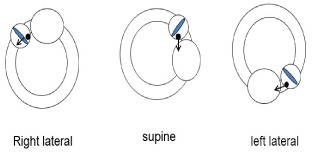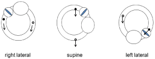 When the patient rolls onto their right side (right lateral position), the otoconia (black circle) moves towards the cupula, induces ampullofugal flow, and left beating, apogeotropic nystagmus is induced. In the supine position, the otoconia stays in the ampulla region on the utricle side and no nystagmus is produced. When the patient rolls onto their left side (left lateral position), the otoconia moves away from cupula, induces ampullopetal flow, and strong right beating, apogeotropic nystagmus is produced.