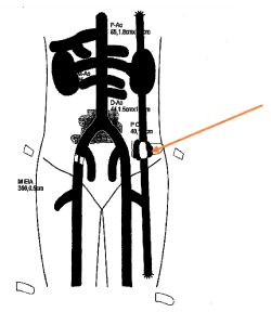 The patient’s initial AFB graft was placed in 2011; Notably, since the initial graft placement in 2011, she had three instances of thrombectomy and revision of the graft: January 2015, March 2016 and, most recently, January of 2018. On physical exam, a large 5-7 cm pulsatile mass was visible on the patient’s left thorax, near the mid axillary line. Vascular exam was positive for a right carotid bruit, non-palpable left femoral pulse, and diminished posterior tibial and dorsalis pedis pulses, bilaterally. Her most recent ABI (July 2018) had shown resting right ABI of 0.34 and a resting left ABI of 1.02. Aorto-iliac duplex examination conducted 1-month prior had measured the mass to measure 2.5 x 2.6 cm with mural thrombus and a residual lumen of 1.2 x 1.3 cm, mass now increased to >6 cm (Figure 1). The patient was afebrile and did not have an elevated WBC count or any other remarkable findings on her physical exam.