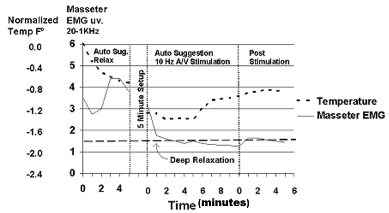In the NuCalm treated subjects two tablets of amino acid supplements including neurotransmitters GABA and 5HTP were orally administered with Theanine relaxant from green tea all of which are known to pass the blood brain barrier when given sublingually. Centro electrical stimulation was applied behind the auricle along known acupuncture stimulation. Neuroacoustic brain entrainment at 10Hz was applied binaurally via earphones and ostensibly consists of relaxing music with hidden entrainment beats in each auditory channel. Light blocking glasses were worn throughout the process. Surface EMGs (SEMGs) were recorded from alcohol cleansed skin over the masticatory and facial muscles at 0, 5, 10, 30, 40, 50 and 60 minutes. All ten subjects were recorded by bipolar electrodes placed at controlled interelectrode intervals by standard Myotronics electrodes. The three studies included rest alone, TENS alone, NuCalm alone and NuCalm and TENS together.