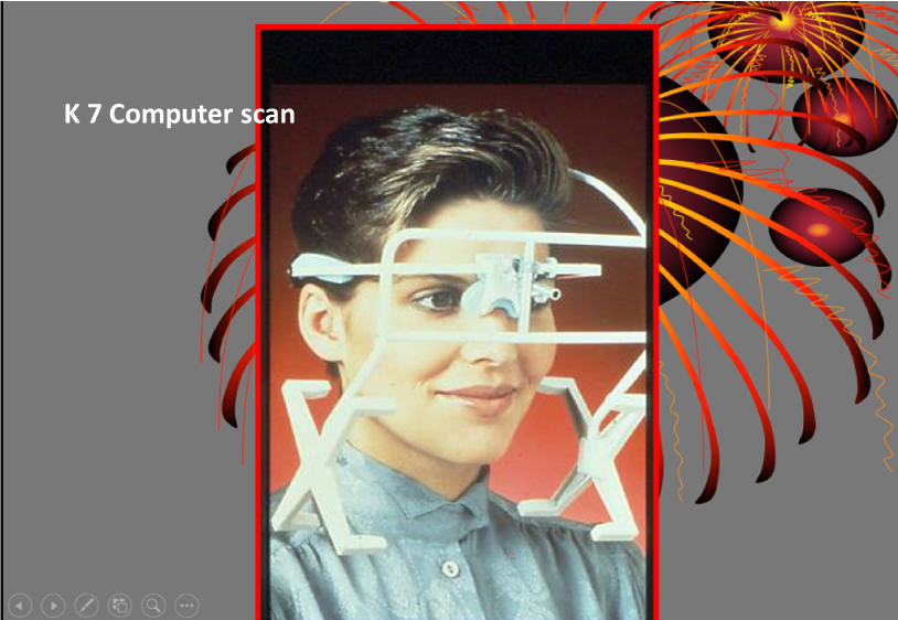 Figure 8 is a kinesiograph (K7 version) scan 4/5 pre and post TENS scans of the sagittal and frontal view of jaw motion from physiological rest to the occlusal plane of a patient in an upright posture. On the left side of the figure is the pre and post treatment scans of the myotrajectory from clinical rest and physiological rest. The TENS evoked jaw motion extends from physiological rest to the centric occlusal plane (CO) and compared with the patient’s voluntary pre-existing habitual jaw motion from aberrant clinical rest in sweep mode. On the right the data is represented in non-sweep mode. The pre TENS habitual closures post TENS pulses are overwritten on the right trace and correspond to the pulses shown on the left side in the sweep mode. For mathematical ease the reader may assume that in this scan 4/5 the vertical scale represents the amplitude in microvolts while the horizontal scale is in hundreds of Hz in scan 18 due to the fact that the scans are similar triangles to the unit triangle of the sine wave.