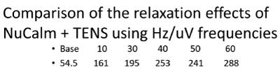 It has been pointed out above that recently NuCalm using only audio BWE has duplicated the effects of AVE treatments and both continue to be in vogue particularly in those patients who find the electrical TENS stimulation stressful. Furthermore no adverse effects of brain entrainment by audio or visual entrainment to date have neither been observed in general or in the potentially pregnant patient. Of course, in muscle relaxation by TENS should not be undertaken in cases of known pregnancy in keeping with FDA regulations. We should therefore critically consider the significance of calculus of amplitude and frequency in this study of muscle relaxation by TENS and NuCalm BWE.