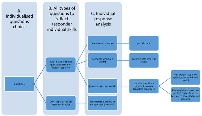We have developed a new technical solution for medical testing in Medical Academy of postgraduate education (dep of nephrology). It’s based on clinical knowledge, experience and the psychophysiological features of the physician who is undergoing an assessment. The basis of this approach is an integrated exam system with personalisation of the responder. There are 3 parts (A,B,C) in the shown algorithm: A) choice of questions depending on the individual features of the doctor being examined, B) multiple choice questions with weight characteristics, and open steps algorithm for each response, and C) individual analysis of response (Figure 1).
