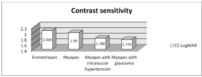Contrast sensitivity (LogMAR): Our analysis showed that CS was reduced in the group of myopes with ocular hypertension and in the group of myopes with glaucoma, while it was preserved in the group of myopes and in the group of emmetropes. (Table 3,4)