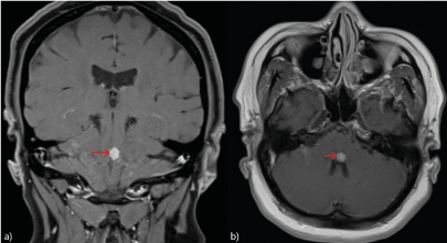 T1-weighted MRI post-contrast a) coronal and b) axial sequence at the time of diagnosis of NSCLC showing a metastatic deposit in the posterior midbrain in the floor of the fourth ventricle (red arrows)