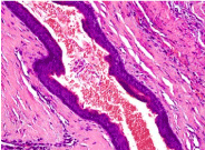 Figure 7. Keratocyst- ortho-keratinized cells with stratified keratinocytes.
