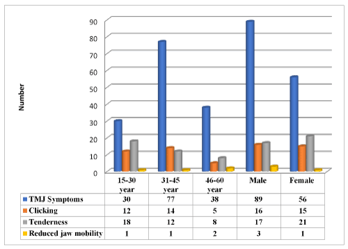 Figure 3. Distribution of the tempromandibular joint symptoms & sign among AIDS Patients according to age & gender