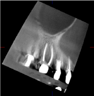 To help in a more precise diagnosis, high definition cone-beam computed tomography(CBCT) was taken. A J-shaped lesion at the apical portion of the distobuccal root of the maxillary right second molar, as seen in the CBCT, raised the possibility of root fracture or an unhealed periapical lesion (Figure 5). This lesion could not be seen on the two-dimensional radiographs taken before. There were also indications of possible communication of the apical portion of the maxillary right first bicuspid with the maxillary sinus, as evidenced by the thickening of the sinus membrane (Figure 6). Mandibular right second bicuspid and second molar did not have any visible fracture, however, the patient’s complaint of extreme pain on those teeth together with the compromised remaining tooth structure, made their extraction and replacement with the implant-supported fixed prosthesis the most logical treatment option. The pain had been intermittent, lingering, and more profound at night time. The teeth responded negatively to routine tests.