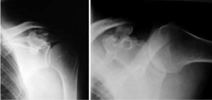 Figure 1. X-Ray of the left shoulder a.p. view a. and lateral view; b. shows osteoarthritis of a coracoclavicular joint with joint space narrowing, osteophytes and several loose bodies consistent (in the ap view).