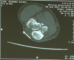 Mr Z, 30 years old , right handed consulted for an 18 months history of spontaneously occuring pain in his right elbow. It was inflammatory type, permanent and resistant to analgesic drugs (paracetamol). The pain was located at the outer side of the elbow and was radiating to the dorsal side of the forearm. He has had multiple epicondyle injections without efficiency in pain relief . Clinical examination revealed a sharp pain caused by lateral epicondyle palpation, painful mobility of the elbow with a flessum of 20 °, whereas pronosupination was normal . X-rays investigation was normal (Fig 1 and 2), biology and electromyogram (EMG) were abnormal. Ultrasonography of the right elbow showed significant synovial thickening with color doppler hyperhemia associated with intra-articular effusion. Scintigraphy showed diffuse hyperfixation of the elbow. MRI showed significant bone and of soft tissue oedema associated with joint effusion. The CT revealed a calcified nidus of the large sigmoid cavity of the ulna surrounded by a clear border within a poorly limited osteocondensation with intra-articular effusion (Fig. 3). The diagnosis of intra-articular osteoid osteoma of the elbow was confirmed and the aspirin test was positive. Because of the difficulty of the surgical approach, percutaneous resection was used under CT guidance. Loco-regional anaesthesia (axillary block) following the classic aseptic rules was done. A guide pin was placed posterolaterally after CT scan and then using a motorized 8mm diameter trephine, a block resection of the osteoid osteoma was performed. The CT control confirmed the complete resection of the nidus (Fig.4). A postoperative immobilization of seven days has been prescribed. The evolution was marked by a complete and immediate disappearance of the pain and a recovery of the elbow mobility. Histological examination confirmed the diagnosis of osteoid osteoma. Thirteen months after surgery, the elbow was painless, with complete mobility, and radiological control showed the ossification of the resected bone core.