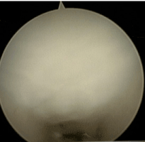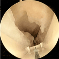 The endoscope should hug the underside of the transverse carpal ligament (TCL) and use the leading edge of the device to push synovium out of the way. Transverse fibers of the ligament should be the only thing visualized in the viewing portal of the device (Figure 3). Defining the distal edge of the TCL is assisted by using a digit from the non-instrument hand to ballot in the area of the distal edge and it is usually 30 mm from the proximal edge of TCL defined at wound dissection. After release (Figure 4) the device is then reinserted to confirm complete division of the transverse carpal ligament.