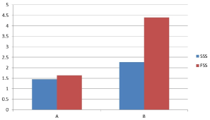 Functional satisfactory score (FSS) showed significant improvement in group A with mean of 1.63 (SD 0.6) than group B with mean of 2.3 (SD 0.26) with p- value <0.05 and there was significant improvement in writing buttoning, holding small and large objects and self-care in group A than group B (Figure 5) shows difference in SSS and FSS in both groups, (Figure 6) show comparative results of SSS and FSS in both groups.