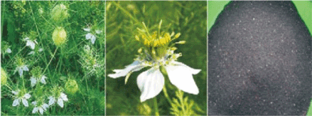Figure 1. Photographs of the Nigella sativa plant, flower and seeds. This figure was reproduced from Ahmad, et al. [1] publication on the basis of noncommercial license