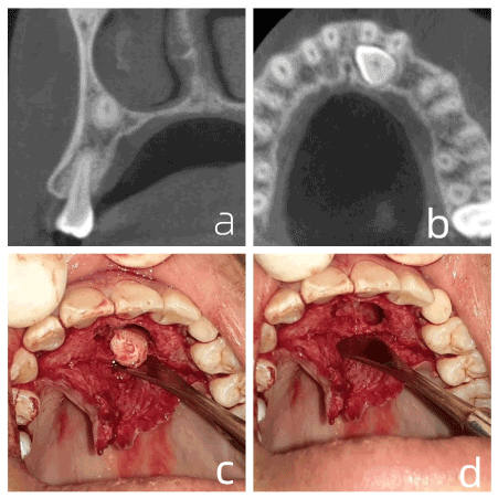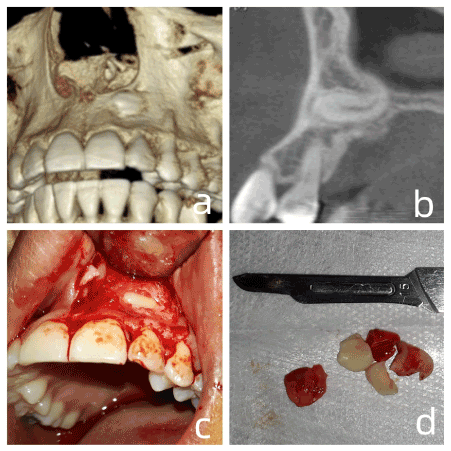 A female patient, melanoderm, 16 years old, and presenting no systemic changes was referred for extraction of an included tooth. Through panoramic radiography, an inverted mesiodens was observed between tooth 11 and 21. Being impossible to determine the vestibulo-palatal position of the referred tooth, a CBCT was requested for better evaluation. Evaluating the CBCT in detail, the inverted mesiodens and palate location were confirmed Figure 2a, and in the 3d reconstruction (Figure 2b) we noticed intimate contact with the nasal fossa. Anesthesia was performed both in the bottom of the buccal groove of tooth 21, and in the incisor foramen. An envelope incision was performed (#15 blade) involving the gingival sulcus from tooth 23 to tooth 13, followed by high-speed osteotomy with a #6 spherical drill to expose the root. The use of elevators to avoid wedge movement, rupture of the nasal membrane, and deviation of the tooth towards the nasal cavity is noted. After the osteotomy (Figure 2c), the root of the tooth was revealed, where #150 forceps were used to manage removal without odontosection (Figure 2d). Finalizing, osteoplasty and abundant washing with saline were then performed, followed by transpapillary suture in the entire anterior region.