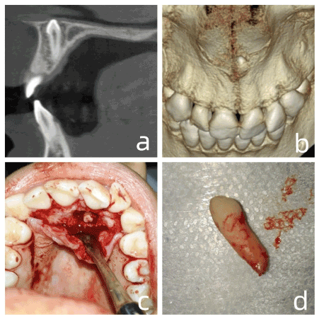 Figure 2. a. Sagittal cut showing the position of the supernumerary tooth. b. 3D reconstruction showing proximity to the nasal cavity. c. root portion of the supernumerary exposed after odontosection. d. intact mesiodens
