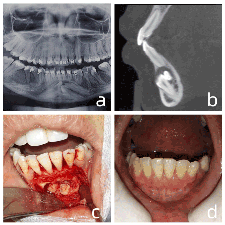 Figure 3. a. initial panoramic radiograph. b. parasagittal section showing external root resorption of 31. c. sequential odontosections to minimize bone wear. d. one month after surgery