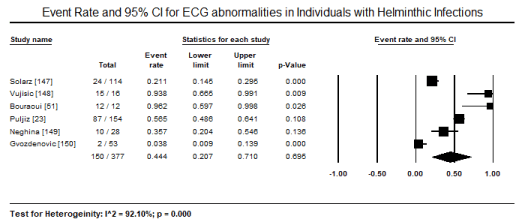 Helminthic parasites are among the most prevalent infectious agents in the world but also they feature prominently among the group of neglected tropical diseases. These diseases affect the most resource-constrained countries and tropical regions of the world characterized by sub-standard housing, crowded living conditions, inadequate hygiene, sanitation and unsafe water supplies, and abundance of insects but diagnosed cases are emerging even in resource-rich countries due to increased international human migration [1]. Although mortality associated with helminthic cardiac infection is low, morbidity and public health burden are significantly high [3,5]. Thus, the present systematic review and meta-analysis evaluates published evidence on diagnostic methods and findings on helminthic CM, as well as determine risk factors, and treatment strategies in patients with helminthic infection associated CM.