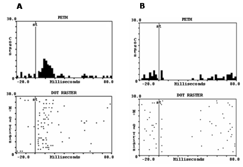 Figure 3. Perievent histograms (PETH) and dot raster displays from 30 consecutive stimuli delivered at 1 Hz, showing the effects of microstimulation of the PPTg in parafascicular neurons. Each dot corresponds to one impulse. The vertical line indicates the stimulus application. A) The most frequent orthodromic response was a short-latency and brief activation. B) Less frequently, neurons were inhibited. The two kind of responses persisted after interruption of polysynaptic pathways that could be co-activated by the stimulation(Adapted from Capozzo et al. [108].