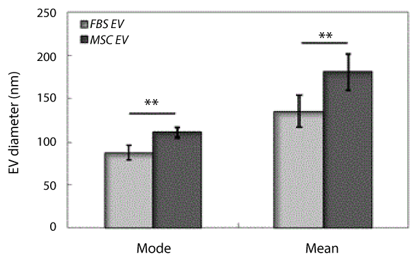 Figure 1. PTA analysis of MSC and FBS derived EVs show significant difference.  Mean and modal diameters of EV derived from MSC1E and FBS are shown. Data represent average ± SD from 9 (for MSC) or 11 (for FBS) independent experiments. Significance levels were assessed with student t-test, p<0.001 is marked with ‘**’ indicating statistically very significant data sets.