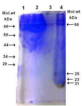 The protein profile pattern of blood sample collected from suspected kidney patients were analysed on 12.5% SDS-PAGE (Figure 3). Low concentration of 34, 29, 25, and 23 kDa protein was observed in 2 samples. Third sample showed higher level of expression of those proteins compared to the control blood.
