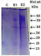 Figure 6. The protein profile pattern of albumin with and without silver nanoparticles treated (E1 and E2) kidney cells and control cells Lane 1 in vitro analyzed on 12.5% SDS-PAGE.
