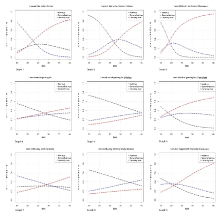 Whereas the most significant differences in sex and BMI were revealed when grouped according to the answers to the three questions: “I would like to be thinner”, “I am afraid of getting fat” and “I am not happy with my body” (Figure 1). Responses to these questions were further analyzed using multinomial logistic regression method. The probability was calculated with which BMI values males and females agreed or did not agree with statements “I would like to be thinner”, “I am afraid of getting fat” and “I am not happy with my body”. Presumptions calculated and presented in Graphs 1-9 show general tendency that females were significantly more concerned about their body and weight.