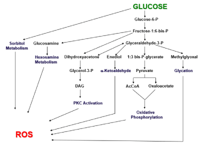 Figure 1. Origins of reactive oxygen species (ROS). Six biochemical pathways by which glucose metabolism can form reactive oxygen species (ROS) are shown. Under physiologic conditions, glucose primarily undergoes glycolysis and oxidative phosphorylation. Under the pathophysiologic condition of hyperglycemia, excessive glucose levels can swamp the glycolytic process and be shunted to the other pathways, with the outcome of forming excessive ROS levels. (Taken from reference 7)