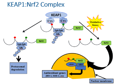 Figure 2. The KEAP1:Nrf2 complex. Nrf2 (nuclear factor erythroid-derived-2-related factor) is generally considered to be the master regulator of antioxidant gene transcription. Under quiescent conditions, Nrf2 is bound by KEAP1 (Kelch-like ECH-associated protein 1) in the cytoplasm, which ushers Nrf2 to proteosomes for degradation. However, in the face of oxidative stress, Nrf2 is released from KEAP1 and it enters the nucleus where it serves as a key activator of the promoter for antioxidant genes. (Taken from reference 16)