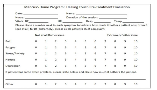 Each HT session was approximately 30 to 45 minutes, using focused meditative intentions and a series of hand positions and movements on and around the patient to create a deep relaxation of mind, body and spirit. Treatments were performed in a designated space with a therapeutic milieu to promote relaxation and focus. Calming music was incorporated, along with dimmed lighting and a comfortable treatment table. In addition to pre- and post-vital signs, participants were surveyed directly before and after their treatments using a simple Likert scale to quantify changes to the target categories of fatigue, stress/anxiety, pain, depression and nausea (see Figure 1). It should be noted that this study is limited to qualitative, patient-reported data. Further investigation was not conducted on the effects of HT on physiological changes to the participants.
