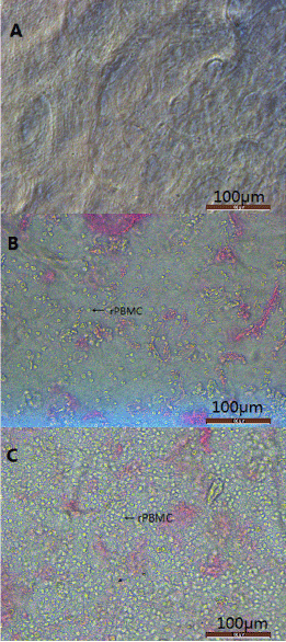 (B). The suspension of peripheral blood mononuclear cells was added to the amniotic membrane, and a small amount of rPMBC was observed under the microscope.