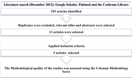The mean number of subjects included in the study was 27 (SD 19.9, range 10-54). In total, there were 53 Males and 45 females with an average age of 47.1 years (range 18-70 years). The duration of symptoms ranged between 3 and 22 months with one of studies, Owens (2011), reporting that all subjects had at least 6 months duration of symptoms [25]. There were eight patients with calcaneal insertional Achilles tendinopathy and 22 with non-insertional Achilles tendon disease in Monto’s study [13]. The other three studies, Gaweda (2010), Owens (2011), de Vos (2010) assessed non insertional Achilles tendinopathy located more than 2cm above the tendon insertion. In the RCT, de Vos (2010) [24], the diagnosis was made based on clinical findings: all patients had a painful and thickened tendon (on palpation and in relation to activity) located 2 to 7 cm proximal to the insertion on the calcaneus. The other three studies [12,13,25] used radiological findings to confirm the diagnosis. As seen in table 3, the majority of the studies had significant methodological limitations, as reflected by the mean CMS of 52 (range 33 - 68).