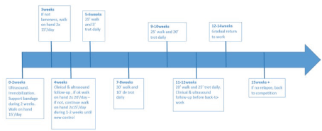 After local disinfection, under ultrasound guidance, a 1 mL solution containing 1x106 TDSCs in DMEM was injected at the injury site at one or two different points using a sterile 21 gauge needle. The limb was bandaged immediately after injection. Bandages were changed every two days and kept in place for two weeks. The rehabilitation program, based on clinical veterinarian experience and on literature design, is described in Figure 1 [2]. During this rehabilitation program the horses were controlled clinically and by ultrasound after one month and two months post-injection.